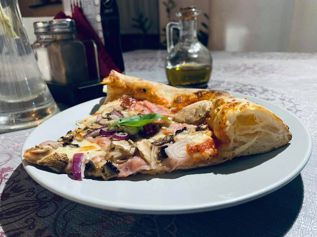 Pizza Capricciosasos pomidorowy, mozzarella fior di latte, szynka, pieczarki, oliwki, bazylia świeża